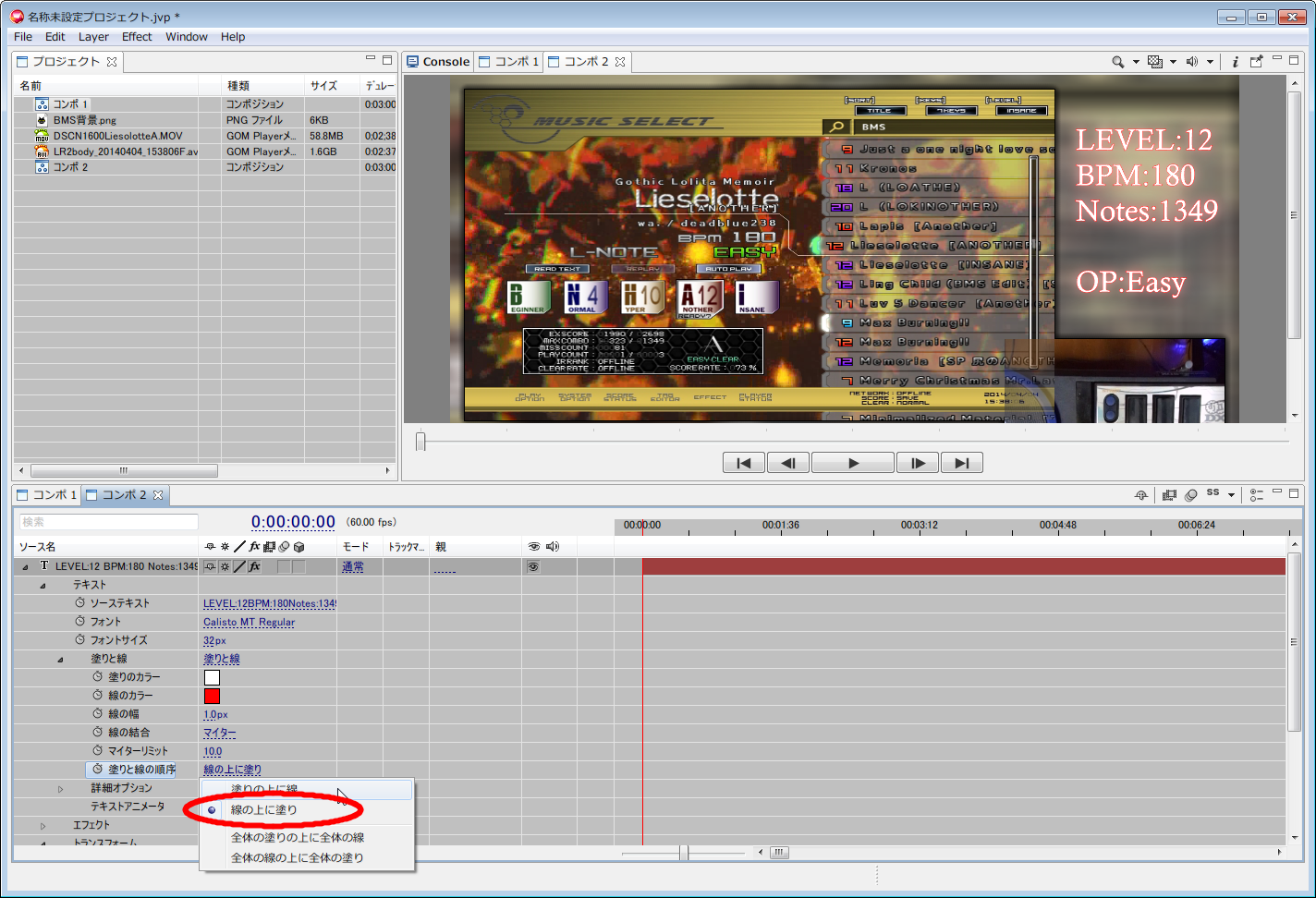 枠を透過PNGで作成したのは、枠画像の後ろに背景として何かを置くためです。今回、BMSのBGA部分を背景として使用します。